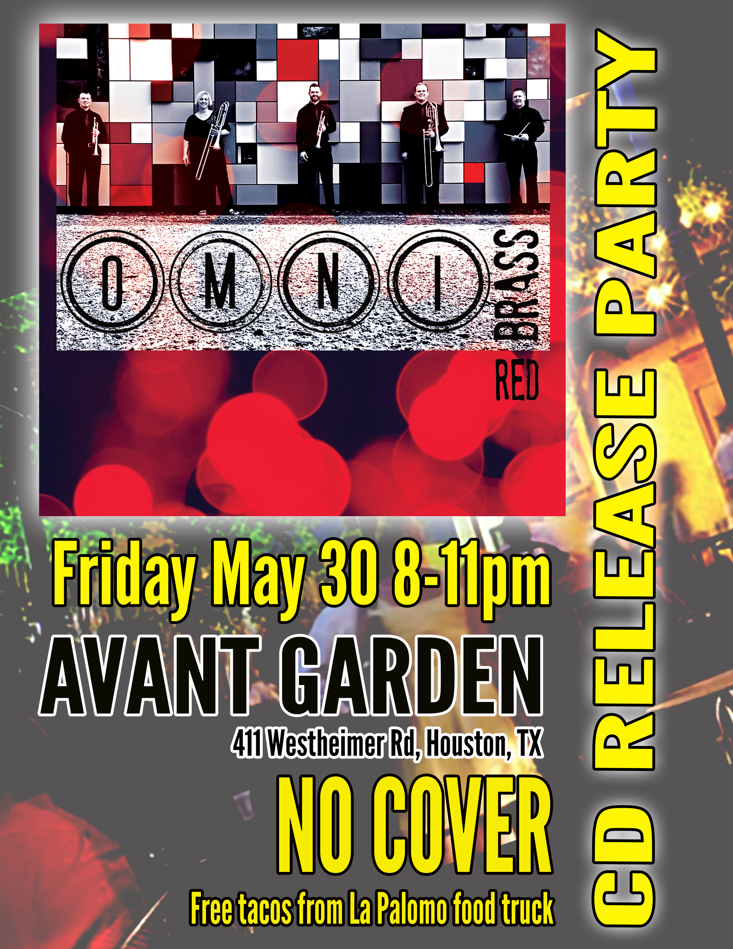 Omni Brass will launch their debut recording, The Red Album, at Avant Garden Houston, Friday, May 30, 8-11pm. The event is FREE! Plus FREE tacos from the La Palomo Food Truck (if you get there early - supplies limited) and an awesome patio setting to enjoy some beautiful evening weather and live music. Come hang out, have a beer, and listen to Omni Brass!