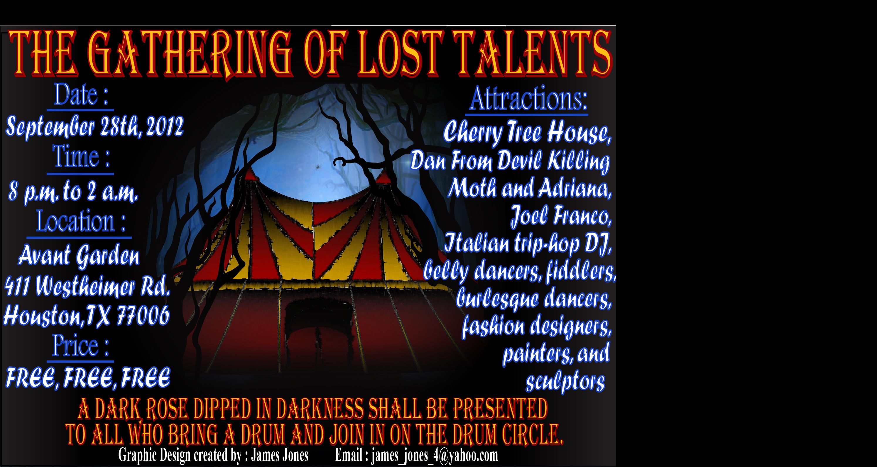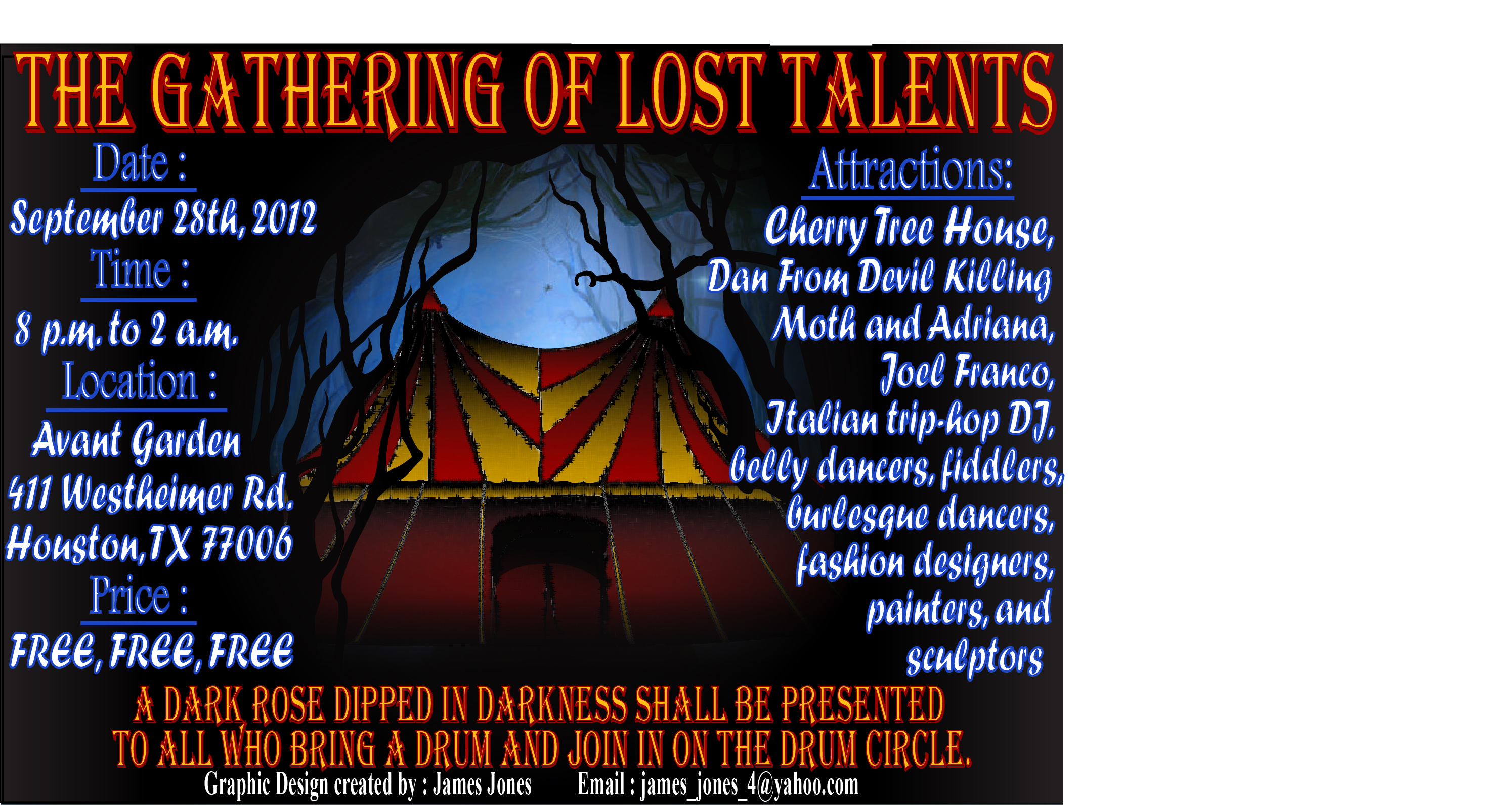 8pm-9pm- drum circle outside and "spill/jacobi" . Arts and crafts booths.