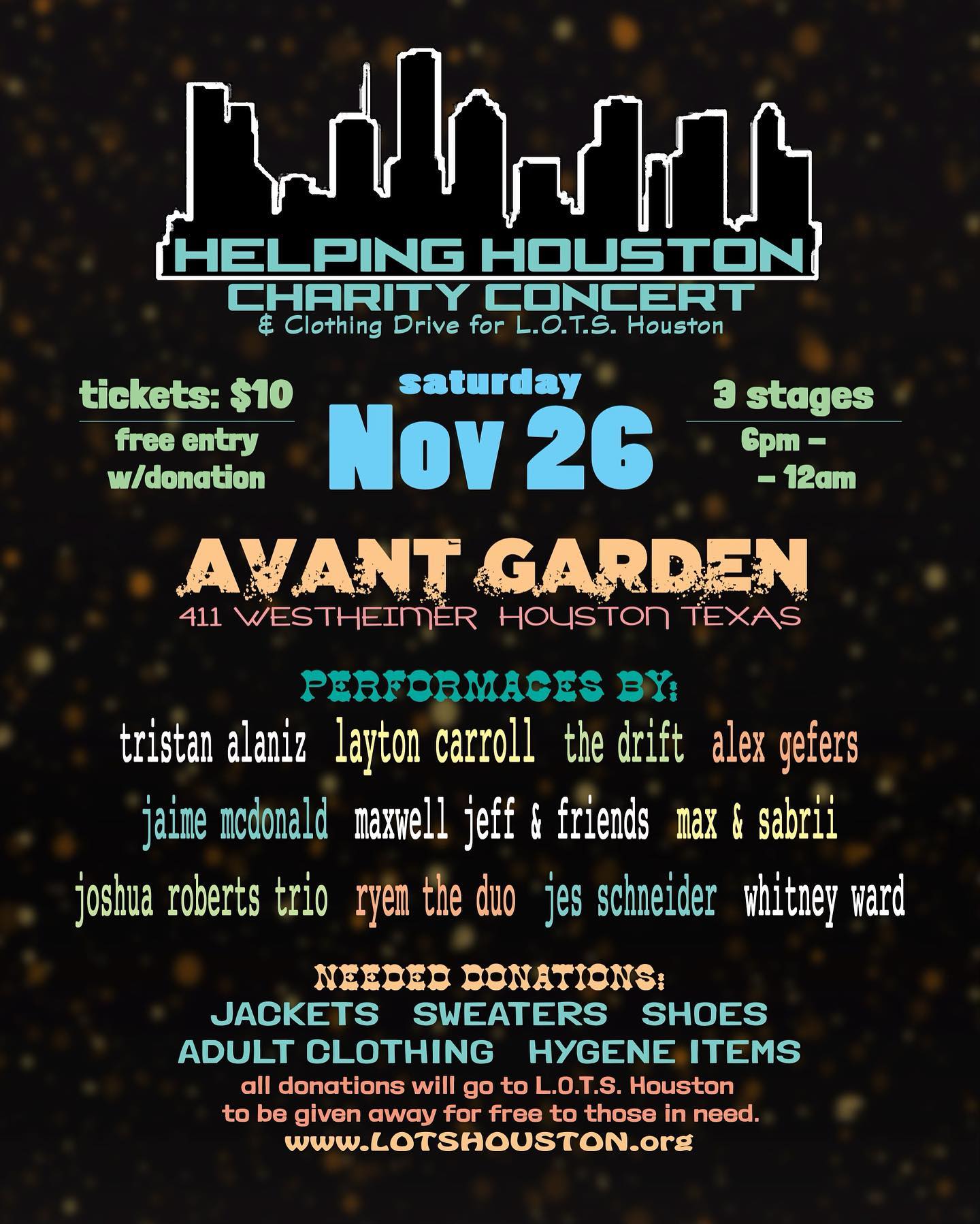 Lotshouston.org, the volunteers, and all the fantastic artists participating in this event. . @whitneyfknward @ali_gindahousse @tris.alaniz @jes_music_ @ryemtheduo @jamieheyjamie
