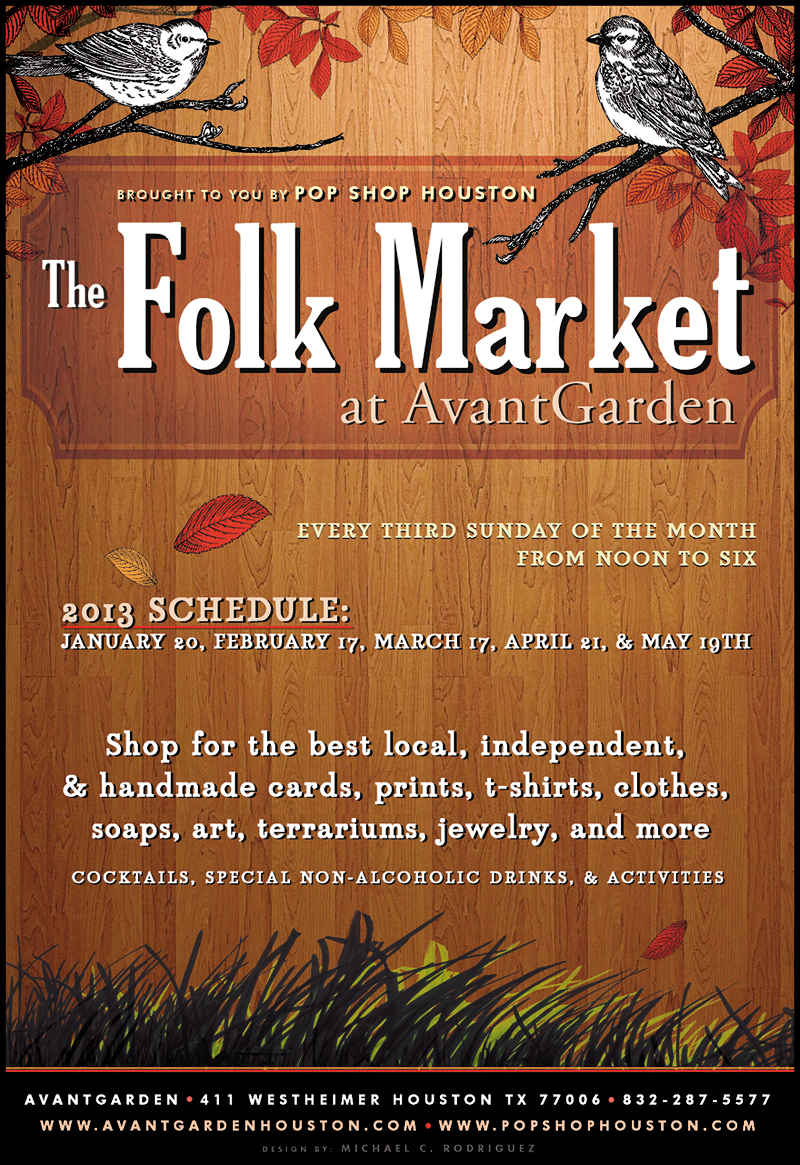 Join us January 20th at the first ever Folk Market a monthly Indie Craft & Design Fair curated by Pop Shop Houston. This event will take place every third Sunday from 12 to 6 pm here at AvantGarden.